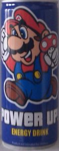 hjälte Super Mario med sin egen energidricka vid namn Power up! Hoppas inte den smakar som pressad flugsvamp…